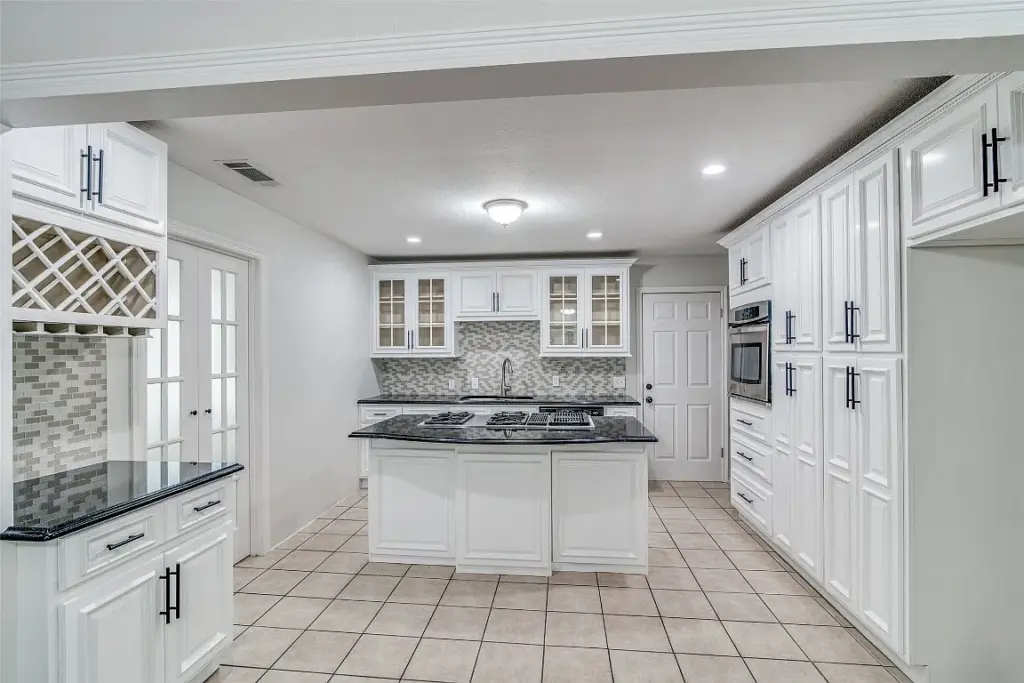 Then, the recently updated chef’s kitchen is great. Here, sleek cabinetry, stainless steel appliances, and striking granite countertops surround a beautiful gas-powered island range. Also, a minibar and wine rack add the perfect entertaining element to this elegant space.