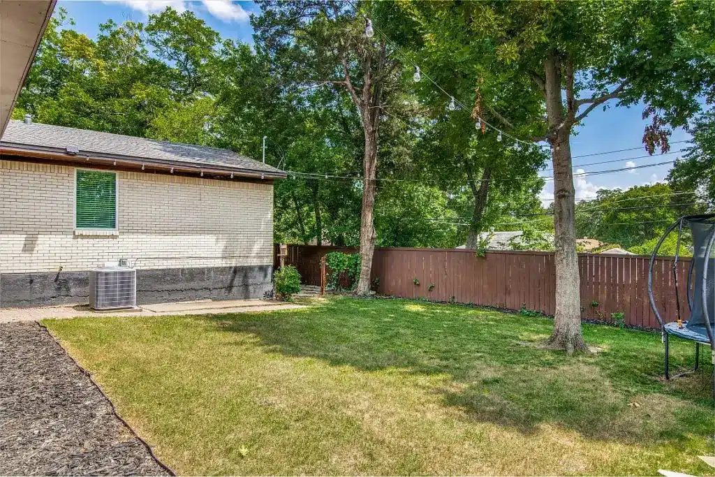 Lastly, the backyard is a perfect suburban escape. Here, mature trees set the backdrop for a peaceful retreat.