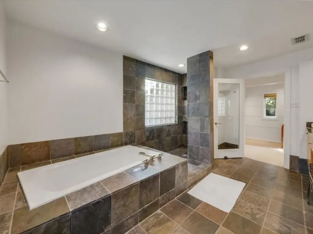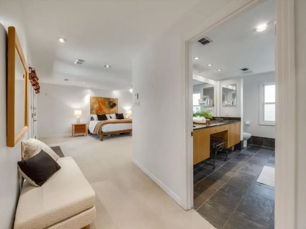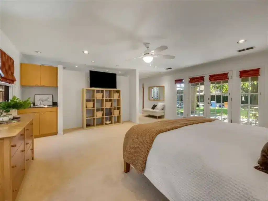 This Athlone home boasts an extension to its primary suite that was thoughtfully designed to preserve the timeless allure of its 1950s origins. As such, the primary suite feels like a remote haven, featuring French doors that lead to a covered patio. Its luxurious en-suite bathroom is appointed with double vanities, an oversized walk-in shower, and a separate soaking tub.
