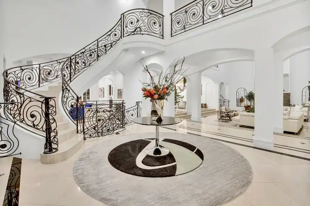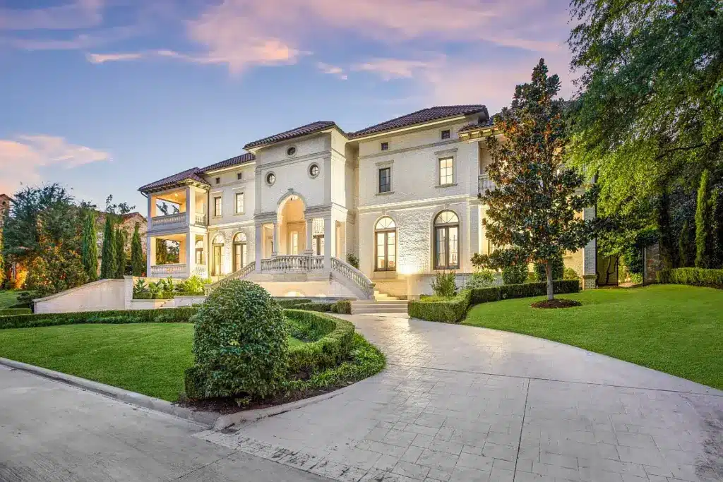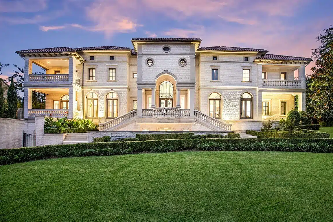 Fanlight windows arch across the front of the estate at 39 Braewood Place, located in Dallas’ gated Glen Abbey neighborhood. Also adding to the impressive appeal are the circular drive, striking stairs, and beautiful balconies of this 13,713-square-foot manor priced at $4.5 million.