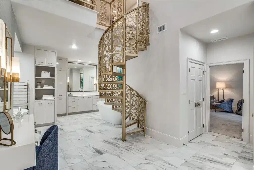 Double vanities in an elegant owners’ suite are expected, of course, in a home like this, but this home offers double commodes and closets, too. To add to the glamour and maybe a little mystery, a staircase leads to a private retreat.