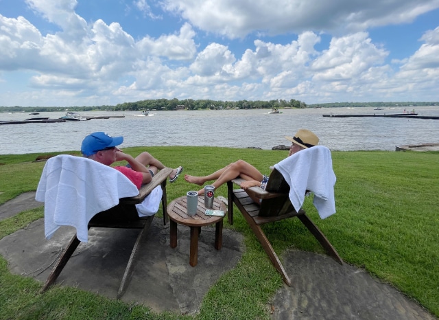 The A-Frame sets the stage for a fully vaulted ceiling in the living room. (It’s right on the other side of that killer fireplace.) In the living area, there’s a bookcase built in. At the end of the long living area, there’s a wall of glass that shows off the amazing backyard that also happens to be huge.