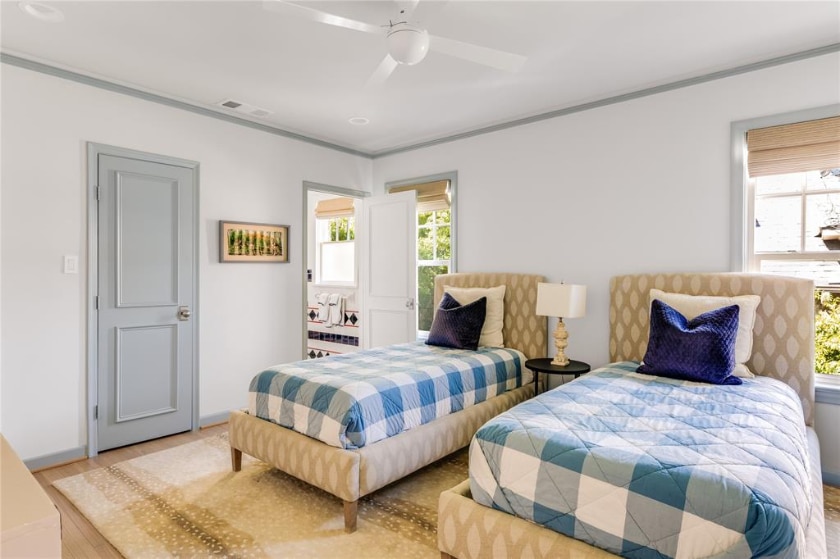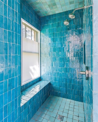 “The principal bathroom was the trickiest part of the remodel,” Watson said. “We spent weeks trying to maximize the space without incurring plumbing issues.” Now, it’s a serene escape with a large fired-clay aqua tile shower with double shower heads, a separate tub, and custom cabinetry. She and Wetz also captured space to create an enormous closet.