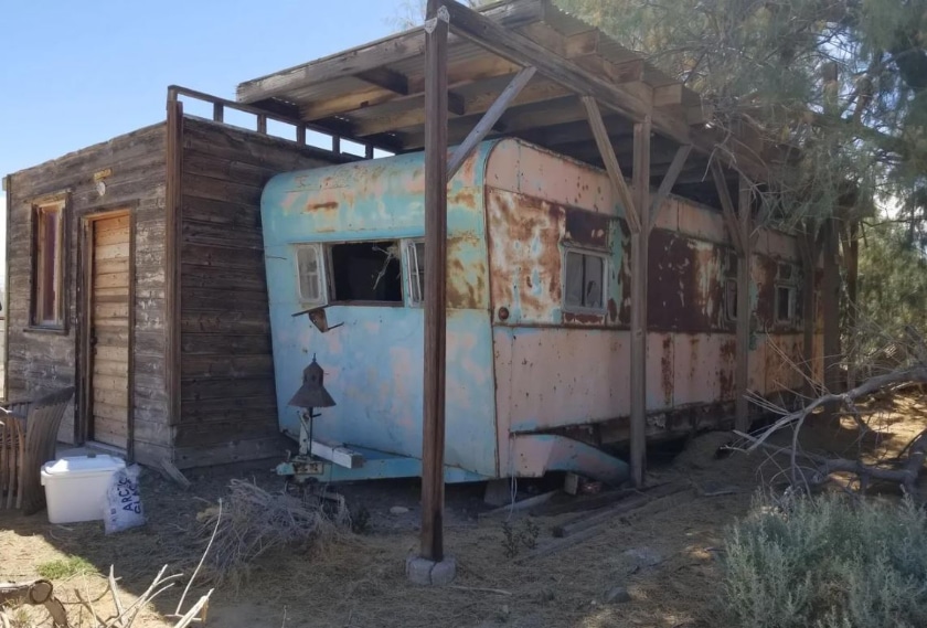 This vintage 1950s mobile home with add-on structure is located at 2143 2nd Street,Bombay Beach, California. It does not list how many bedrooms or bathrooms it has because it is most definitely a fixer-upper. You can have as many bedrooms and bathrooms within the 500 square feet as you want.