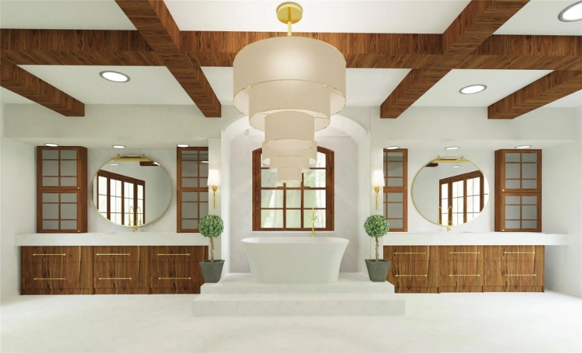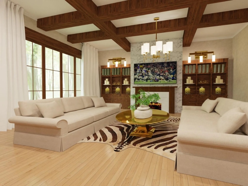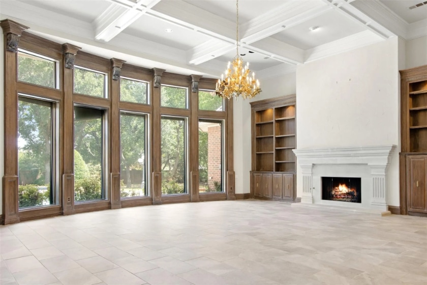 There are four large bedrooms and seven bathrooms. The kitchen is already equipped with gas and electric cooktops, dual dishwashers, a SubZero refrigerator, and a large walk-in pantry. The main level features the principal suite and a library with a fireplace. Don’t forget to ask Harrington to show you the secret closet! Upstairs, you will find ensuite bedrooms, a game room, and a hobby room. Harrington had renderings made to give buyers a visual reference of the home’s potential.
