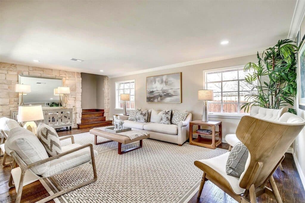 My, my … what would my grandparents think? They built their home in Tanglewood, the first development in Edwards Ranch, on Preston Hollow Road in 1960. The then-new addition was home to simple but attractive ranch-style houses and several daring modern designs. Those original ranch houses now sell for north of $600,000. In short, the area has continued to prosper. With its plentiful mature trees, winding streets that divert through traffic, and the allure of highly rated Tanglewood Elementary School, a Tanglewood listing — especially a revamped ranch is very desirable and, more often than not, short-lived. This listing is only six hours old.