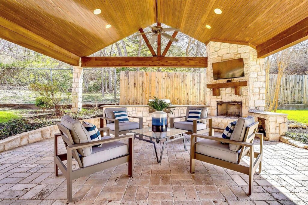 The backyard has three seating areas one of which has an outdoor fireplace. At the side is a two-car garage.