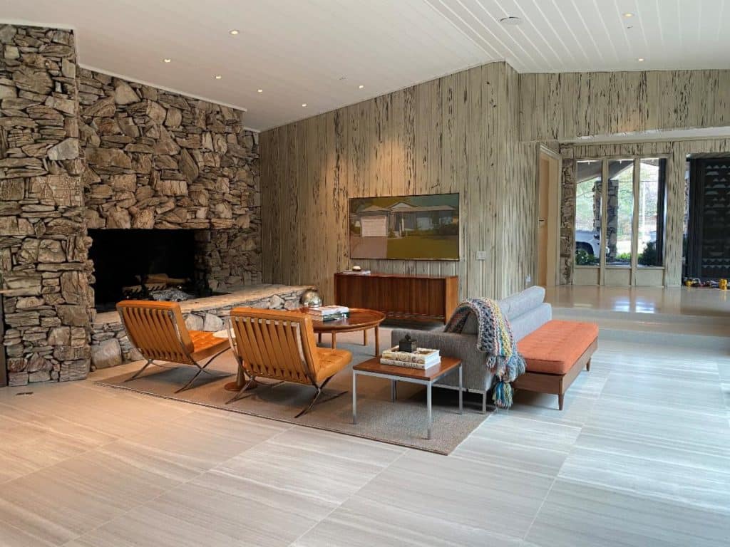 Because of the vital relationship between the site and the house, it was important to Vega to use natural materials and connect the house to the exterior wherever possible. This is showcased to great effect by the stone wall that slices through the house.
