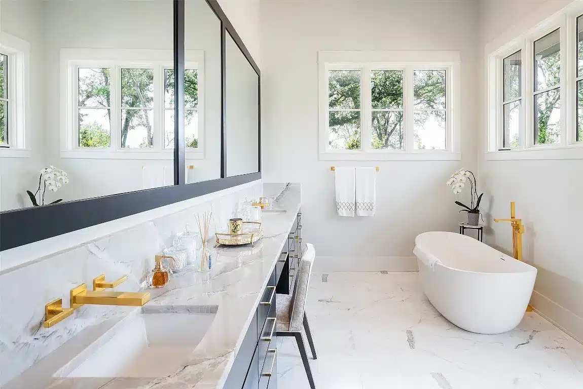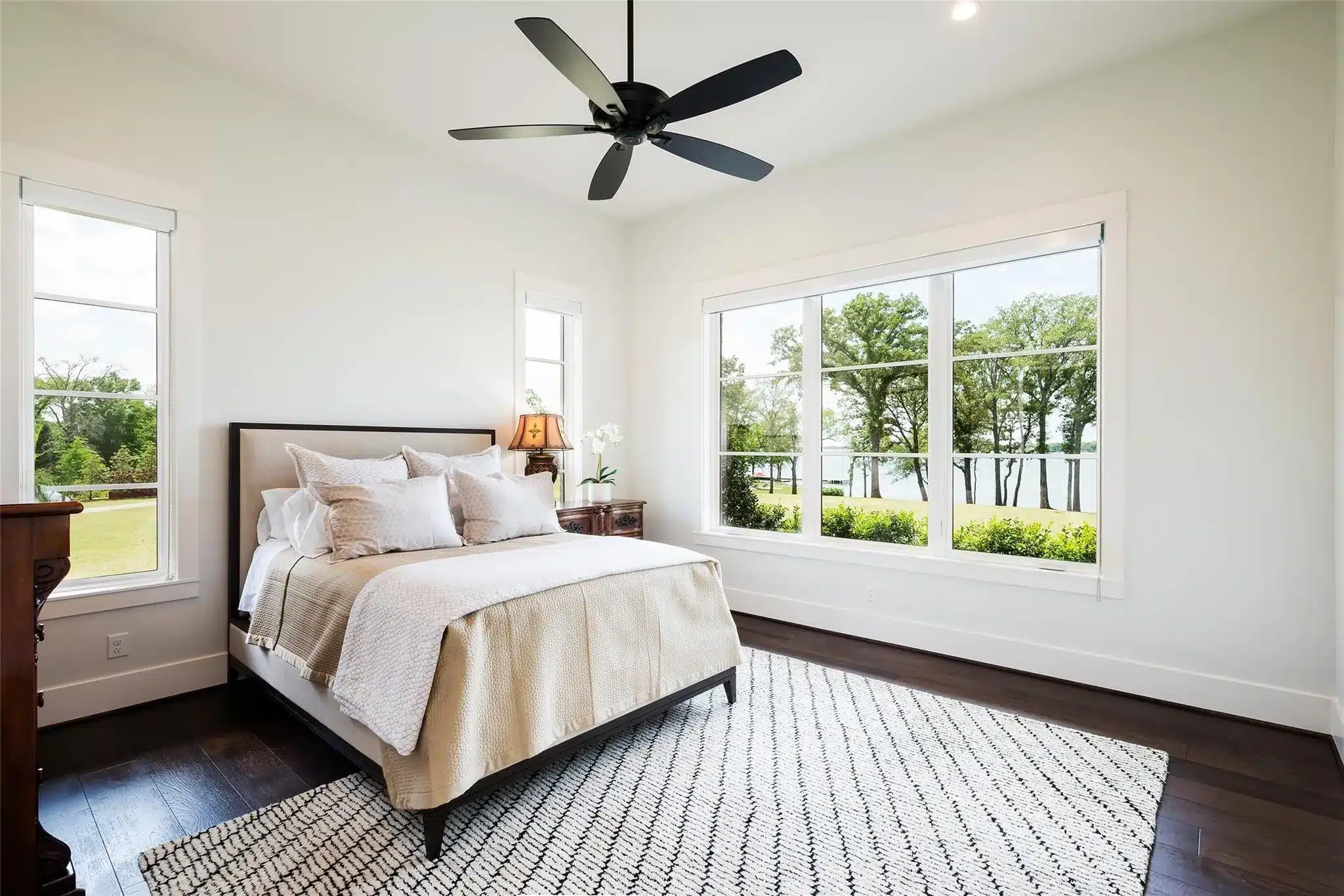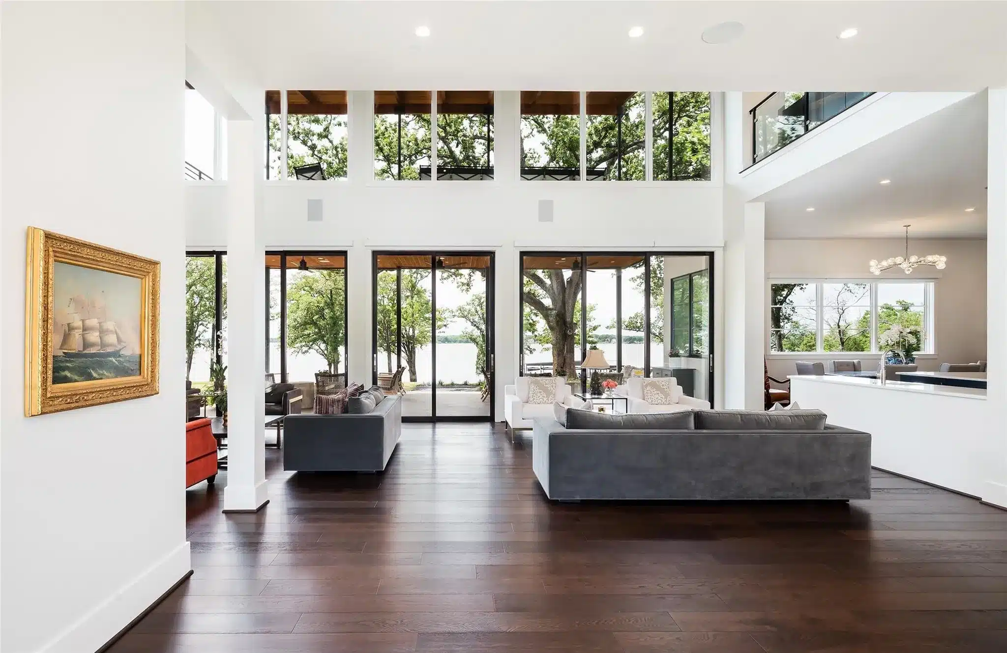 The main house has nine luxurious bedrooms with ensuite bathrooms and two powder baths. It’s a bright and inviting transitional that seamlessly blends indoor and outdoor living spaces with two-story windows, expansive balconies, and sweeping views of Cedar Creek Lake. And that’s what you came here for, right?