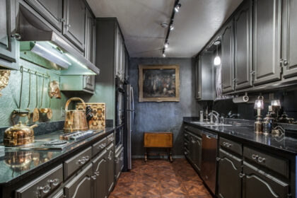 The bedrooms are good-sized: the master measures 15-by-13 and the second bedroom measures 14-by-13. Both have new carpeting and multiple windows. The bathroom is decked out with double sinks, marble countertops, accent lighting, and decorative mirrors. The bathtub has a custom tile surround with a shampoo nook.
