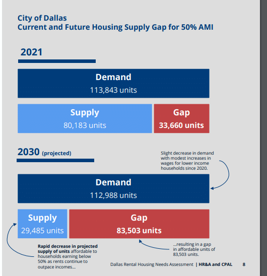 The rental housing gap is growing, Flores explained. By 2030, the City of Dallas is projected to have a gap of 83,500 rental units for households at or below 50 percent Area Median Income.