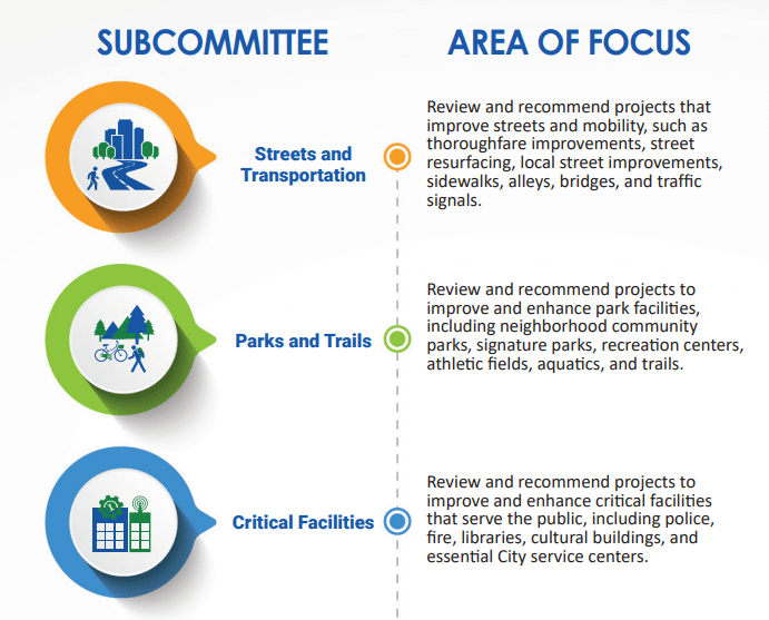 Prior to the installation of subcommittees and the news that the city had a capacity for $1.1 billion rather than just $1 billion, Dallas staff presented a framework for the bond with the following possible scenarios: