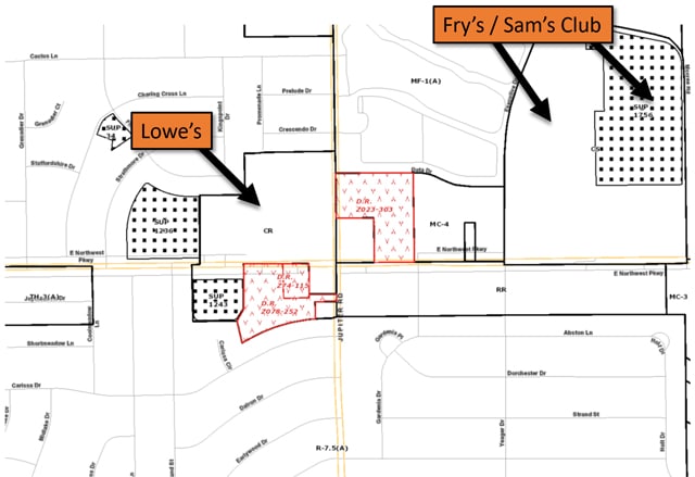 All that said, let’s zoom in. Above is the intersection of Northwest Highway and Jupiter. On this map you see SUPs with the black squares background. One was granted for Sam’s Club (likely for their gas station). Another was for Bethel Lutheran Church. Lowes is zoned CR or Community Retail while southeast of Jupiter and Northwest Highway it’s RR or Regional Retail. The DR designations in red stand for Deed Restrictions (which could mean anything and are worth looking into).