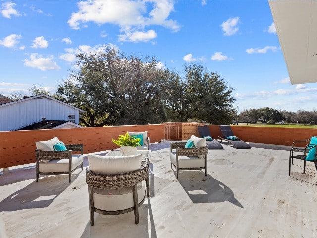 The home’s upstairs includes a second living area with balcony access, plus three bedrooms, which can also be used as an office.
