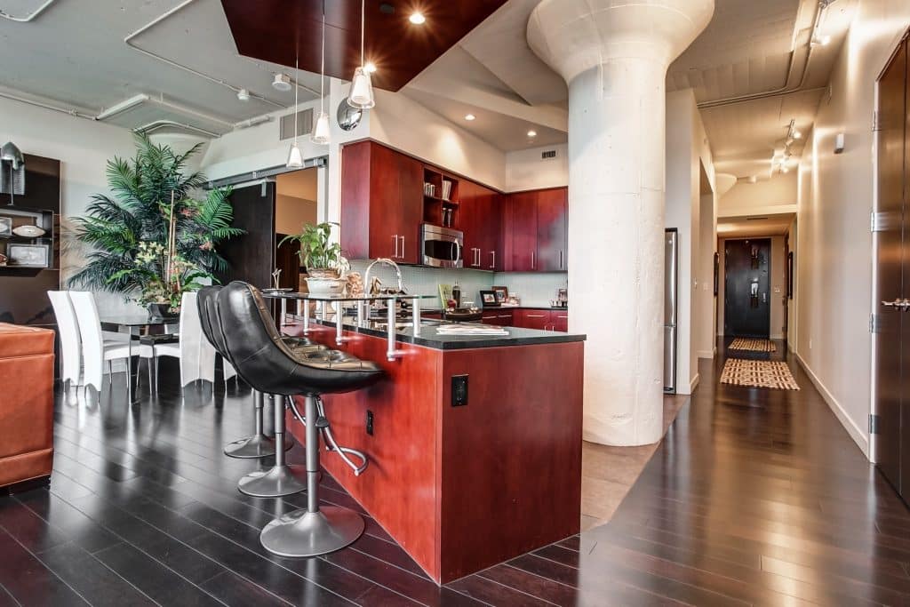 Found on the fourth floor of the building, #2450 is a two-bedroom, two-and-one-half bathroom, high-ceiling, exquisite condominium with amazing downtown views.