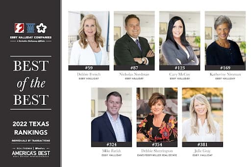 Every year in June, the best in residential real estate are decided by Real Trends and Tom Ferry America’s Best Real Estate Professionals. They rank agents across the country based solely on two things: the total number of transactions (home sales) an agent participated in and the total sales volume those sales generated. Wednesday those rankings came out, and it was an exciting day for the Ebby Halliday Companies.