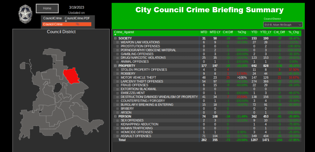 The crime rates in almost all categories for District 10 are lower today than they were at this time last year. Property crimes have dropped 16 percent and crimes against persons have dropped 20 percent, according to the City of Dallas crime statistics dashboard. An overall 18 percent decrease in crime was reported in District 10 year-to-date.