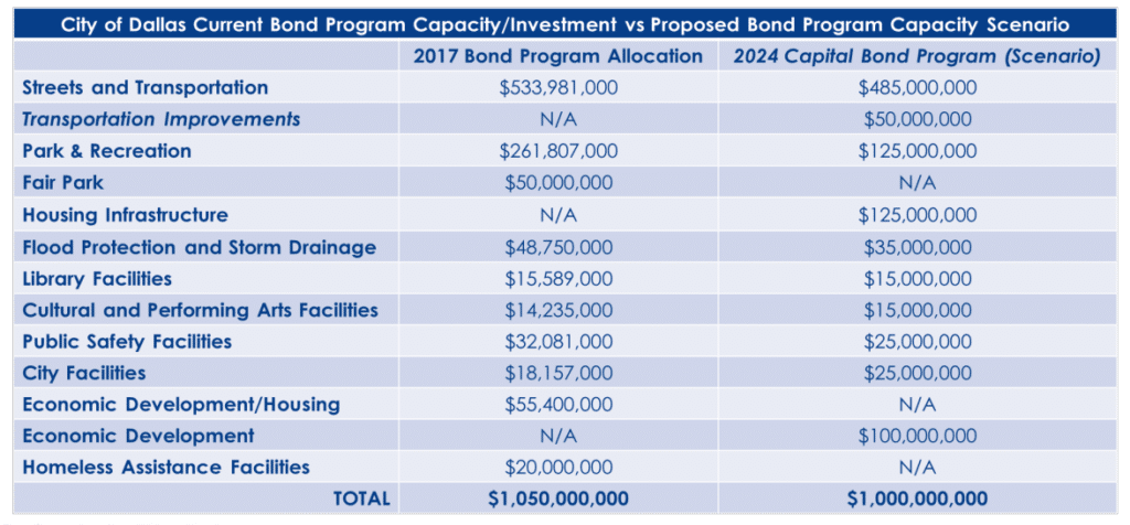 The task force, composed of a chair appointed by the mayor and 14 council-appointed members to represent each district, will recommend the 2024 bond program in January or February, Nicewander said. The Dallas City Council will ultimately vote on the projects and allocations.