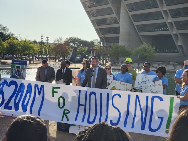 “We had a great rally out in front of City Hall this morning with over 100 people chanting their support for housing,” Brundage said. “As you vote on this year’s budget, which allocates less than 1 percent toward housing, we also want to point out that Dallas has yet to invest more than $6.3 million in bond funding toward housing since 2003. Dallas needs 100,000 new or refurbished affordable homes by 2033 to meet the housing demand.”