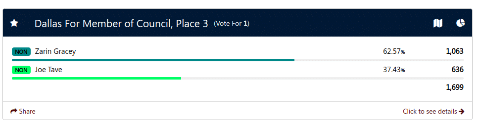 The District 3 race was the only City Council contest forced to a runoff. Every eligible incumbent returned to their seats, and the District 10 position, vacated by term-limited Adam McGough, was sealed outright May 6 by former Uptown Dallas Inc. Executive Director Kathy Stewart.
