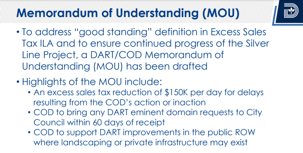 “Aside from the assignment of Silver Line betterment costs, DART, the [North Central Texas Council of Governments], and the [City of Dallas] discussed mitigation of the $43.5 million in delay costs associated with Silver Line permit review and approvals,” Perez said in the memo. “Through the mitigation discussions, DART and City staff recommend that the COD assumes $15.9 million of the delay costs. Reducing the assigned betterments and assumed delay costs from the $111.1 million, the COD would be allocated $90 million in DART excess sales tax revenues.”