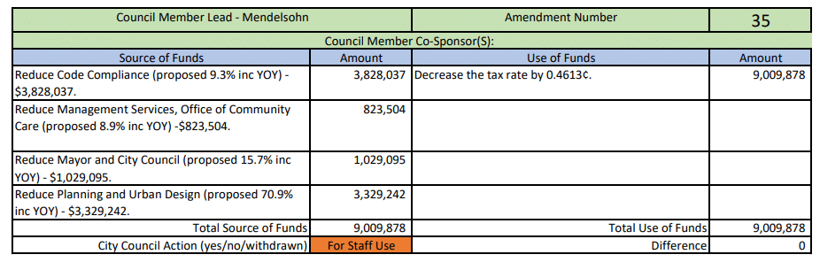 Amendment 28A represents about $13.4 million in cuts to City Manager T.C. Broadnax’s proposed $4.63 billion budget. By making those cuts, the tax rate can be further reduced by 1 cent, Bazaldua said.
