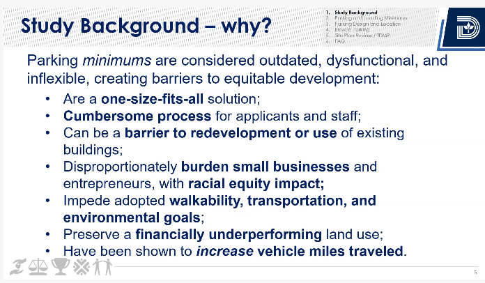 The idea for comprehensive parking reform was initiated by District 1 Councilman Chad West in 2019. The issue was widely discussed by ZOAC in 2020 and 2021 and resurrected in August, again by West.