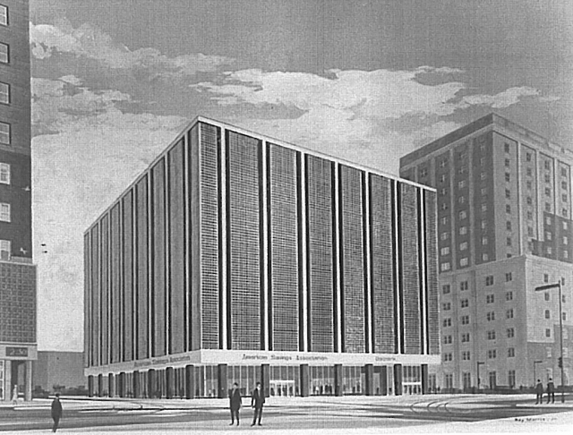 The Dalpark Garage opened on May 1, 1968, and included a 13,000-square-foot home for American Savings Association on the lower floor. Advertisements described it as “the world’s most beautiful garage” and “a calm haven for 800 fidgety parallel parkers.” Also touted were the landscaped gardens and magnificent domed rotunda.