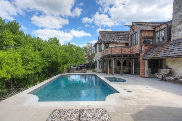 Another post-Dilbeck addition would be the pool. It fits perfectly with the home and surrounding landscape. Because the homesite slopes in the back, the pool is built into a retaining wall and gives a negative edge feel, and is protected with privacy trees.