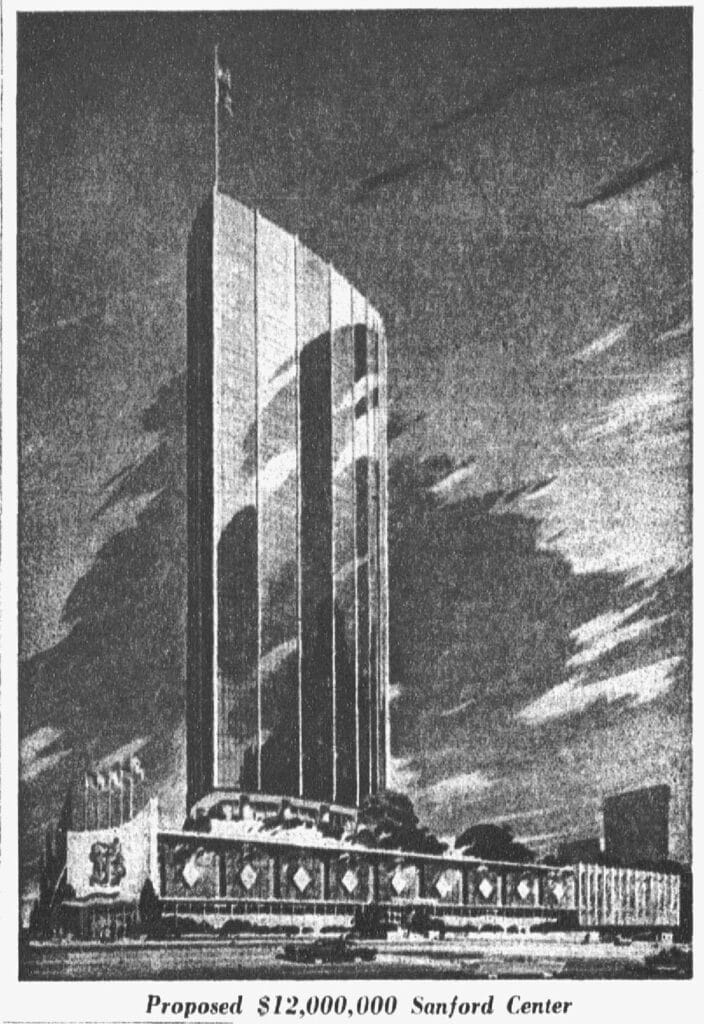 Sanford initially unveiled his plans for his prominent lot at Ross and Akard in 1958 but didn’t break ground on the project until 1961, coinciding with the Bronco Bowl’s debut. The aptly named Sanford Center was envisioned as a $12 million project designed by architects Roper & Vance. The three-story base would house retail and parking, topped by a 26-story luxury apartment and hotel tower complete with roof gardens and a pool. A rendering of this proposed building, as featured in The Dallas Morning News, showcased its stunning design.
