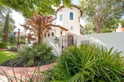 The large master has space for a home office or sitting area, as well as an ensuite bath and walk-in closet. Off the dining room through French doors, a lovely flagstone courtyard with landscaping and window boxes. There’s also a two-car garage.