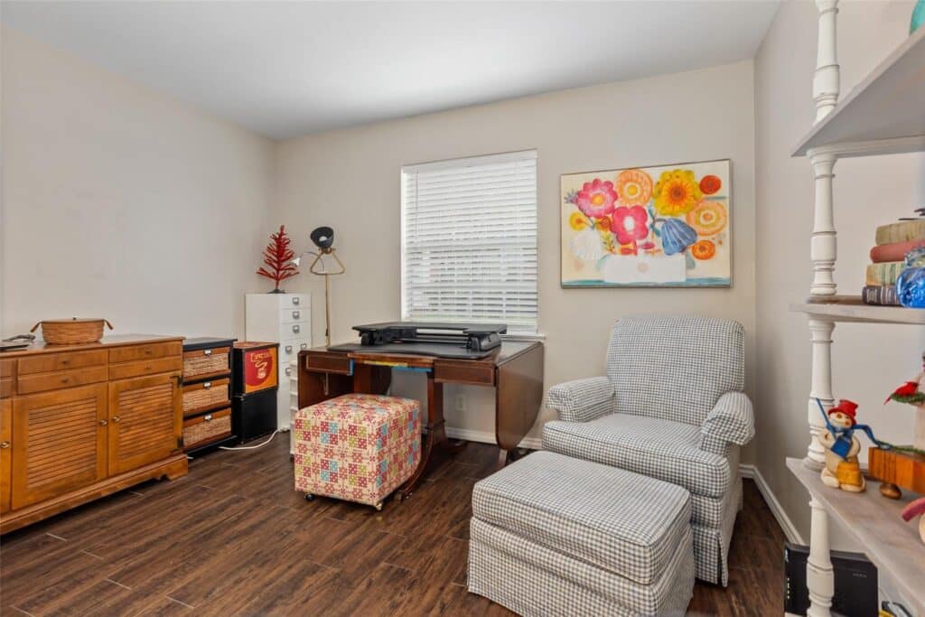 The unit has a true primary suite with an attached bath — recently renovated — also with granite counters and a walk-in closet. The second bedroom is currently being used as an office.