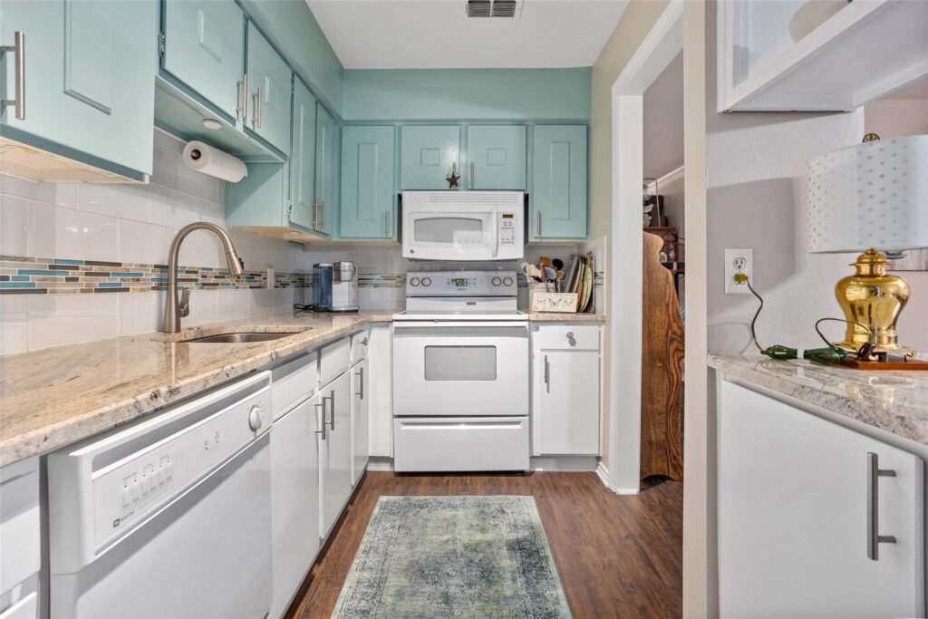 The galley kitchen has ample openings to the dining area, keeping it from feeling confined. It’s a very cheerful space with bright white appliances and lower cabinets with pleasing celedon painted uppers. Countertops are granite.