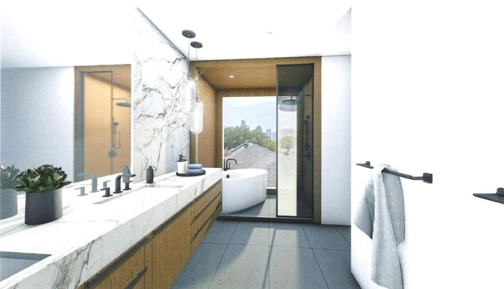 As you’ll see in the photo gallery of blueprints, the primary suite is located on the third floor, where you’ll find wall-to-wall windows that offer spectacular views of downtown Dallas. The en-suite bathroom features custom cabinetry, floor-to-ceiling lilac marble, a large soaking tub, and a spacious walk-in shower.