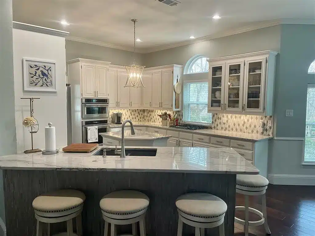 Located in Arlington’s Viridian development, this house sits in this master-planned community just south of the DFW International Airport. For a dual-career couple going opposite directions, it’s an easy commute to both Dallas and Fort Worth.