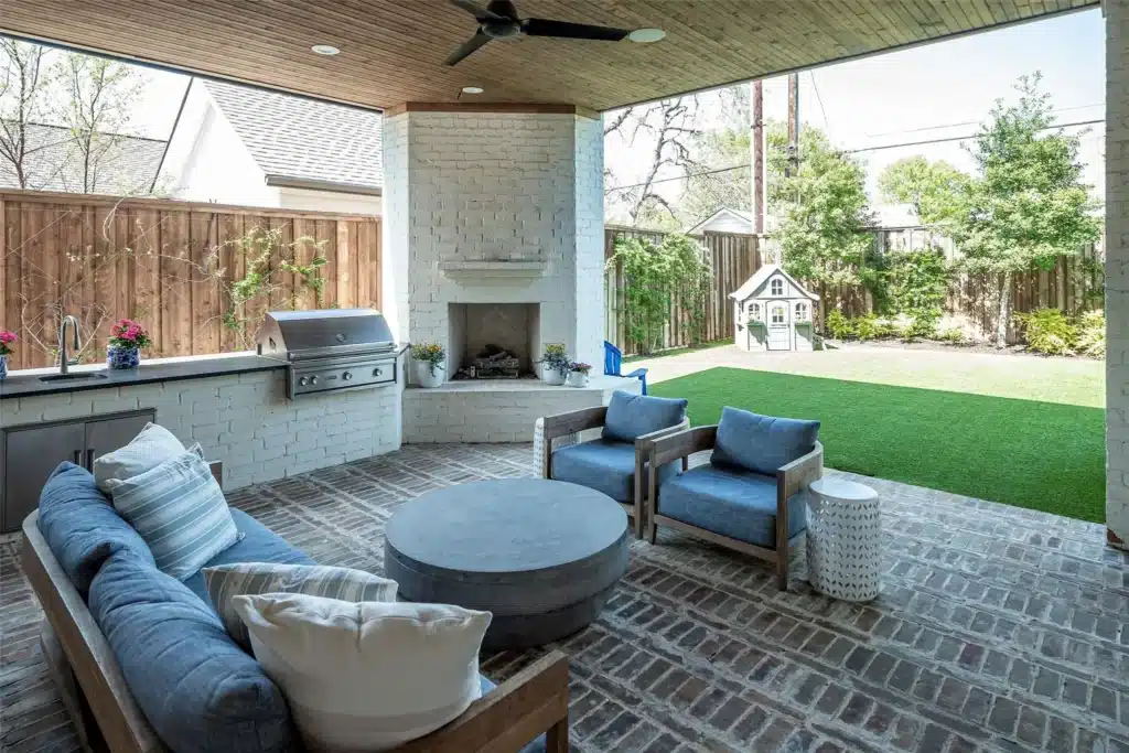 We’ve established that Texas’ springs equal excellent weather, but enjoying the outdoors all four seasons is available with this home’s electric screened-in patio. Its grill and fireplace allow the homeowners to enjoy the outdoor kitchen in rain or shine since the patio is covered. In addition, the front porch leaves space for seating so the homeowners can watch the world go by from that location.