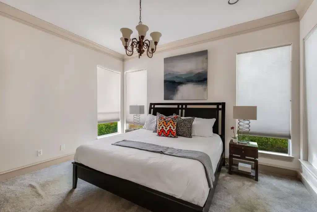 Then, just over a cozy dining area, a beautiful modern kitchen beckons. This gourmet’s dream features stainless steel appliances, a gas range, and plenty of black quartz counter space. Also, this area contains a ton of cabinetry for maximum storage options.