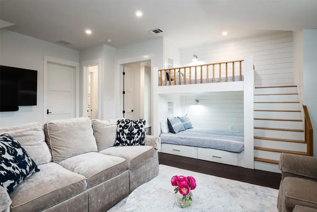 Of the home’s nine bedrooms, a primary suite, a junior suite, and a guest room are located downstairs. The remaining bedrooms — including two fabulous bunk rooms — are located on the second floor, offering family and guests privacy with their own ensuite bathrooms.