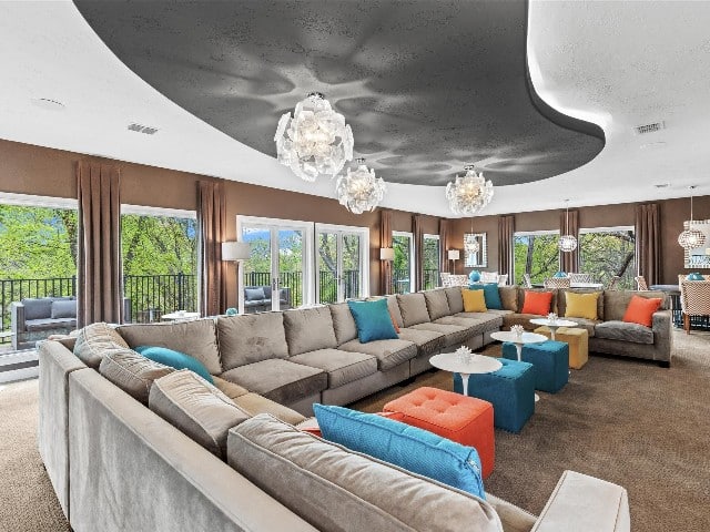 Inside, the floor plan is open and flowing. The same limestone that is used on the exterior is frequently found as accent walls or columns.