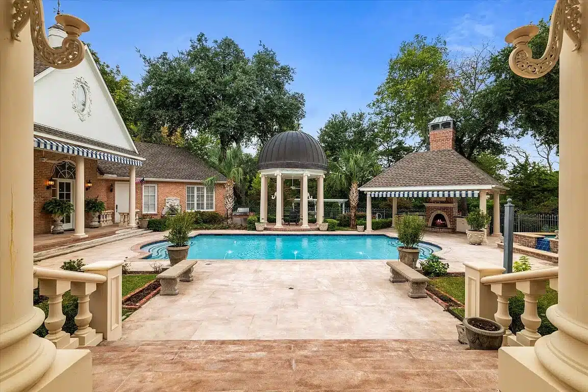 Besides the numerous package-hiding spots, this house has other features worth exploring. A fabulous foyer with an eye-catching staircase, hand-painted wallpaper, and an outdoor cabana with a saltwater pool are other reasons to like this house.