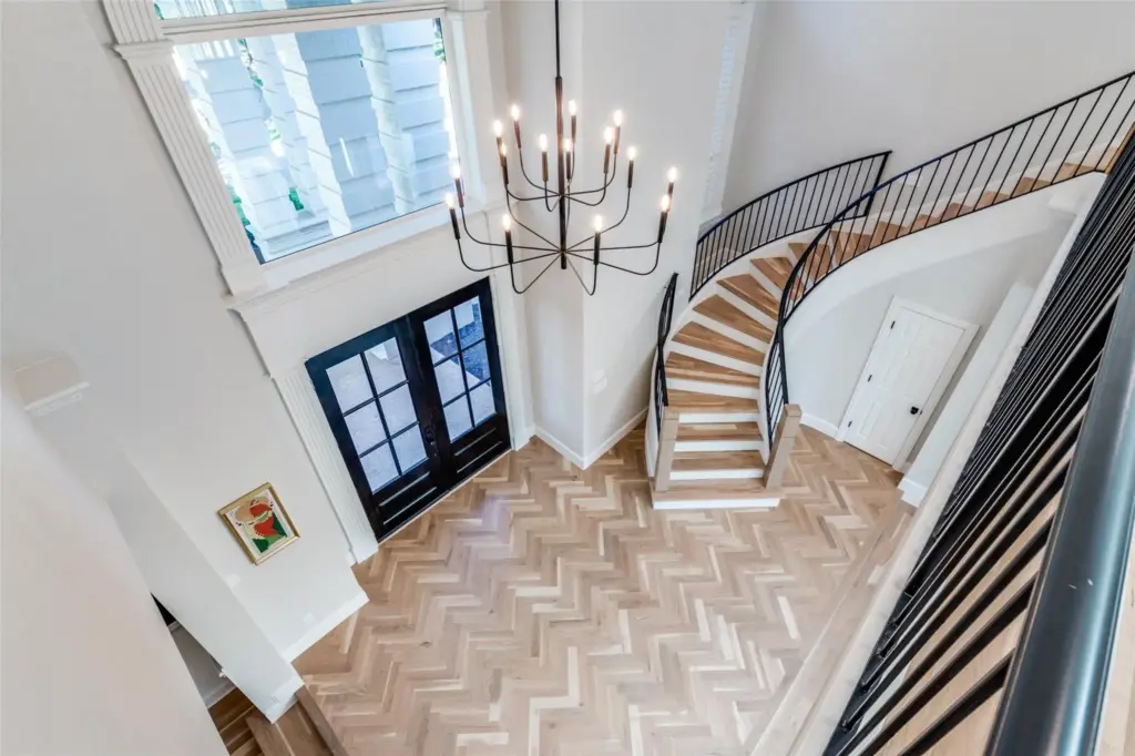 As you step inside, a stunning entryway sets the tone for the entire experience. Designer lighting fixtures illuminate the space, casting a warm and inviting glow over the herringbone wood floors.