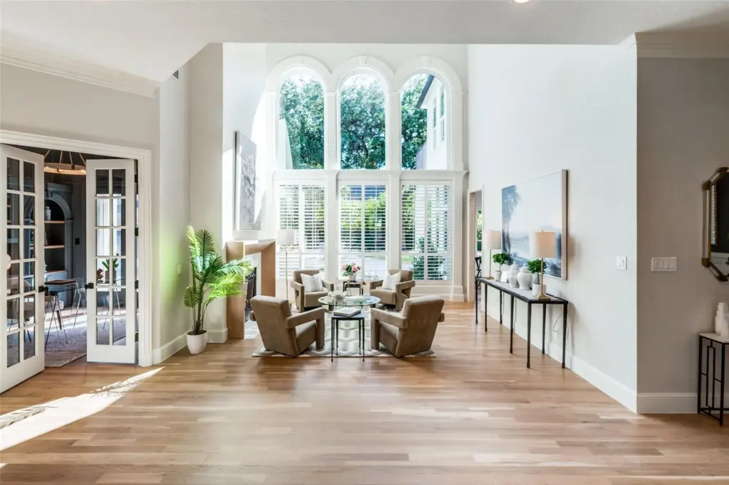 As you move from the entry, you’ll be drawn into the bright open living space, where soaring ceilings and floor-to-ceiling windows flood the rooms with natural light and offer breathtaking views of the backyard and the newly remodeled pool.