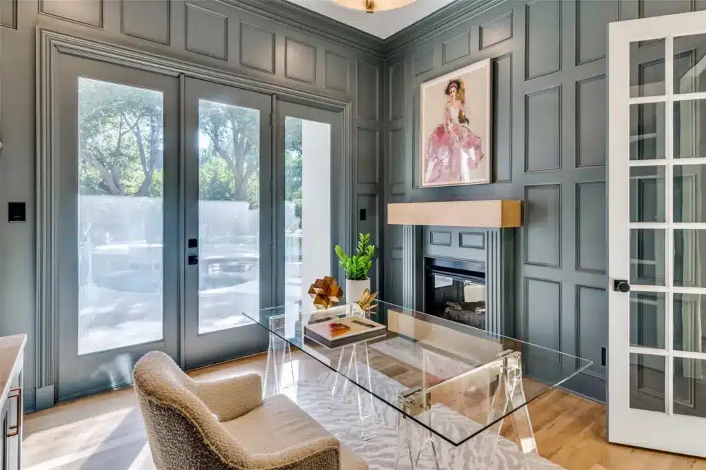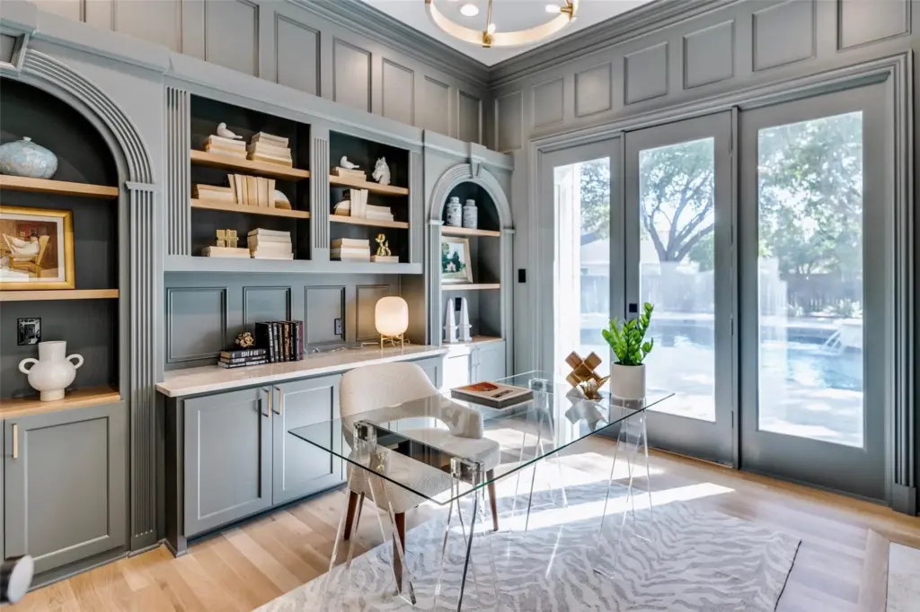 For those seeking a workspace that combines productivity with elegance, the executive study is not just an office; it’s a place to work from home in style. Thoughtfully designed, it features a cozy fireplace, exquisite built-in cabinetry adorned with detailed molding and wainscoting, hardwood floors and large windows. Imagine this as the backdrop for your next Zoom call – a tranquil poolside Oasis that turns your workdays into a virtual vacation. The ability to step out between meetings and enjoy a covered patio just off the pool adds an extra layer of convenience and luxury to this executive retreat, ensuring that work and relaxation seamlessly coexist.