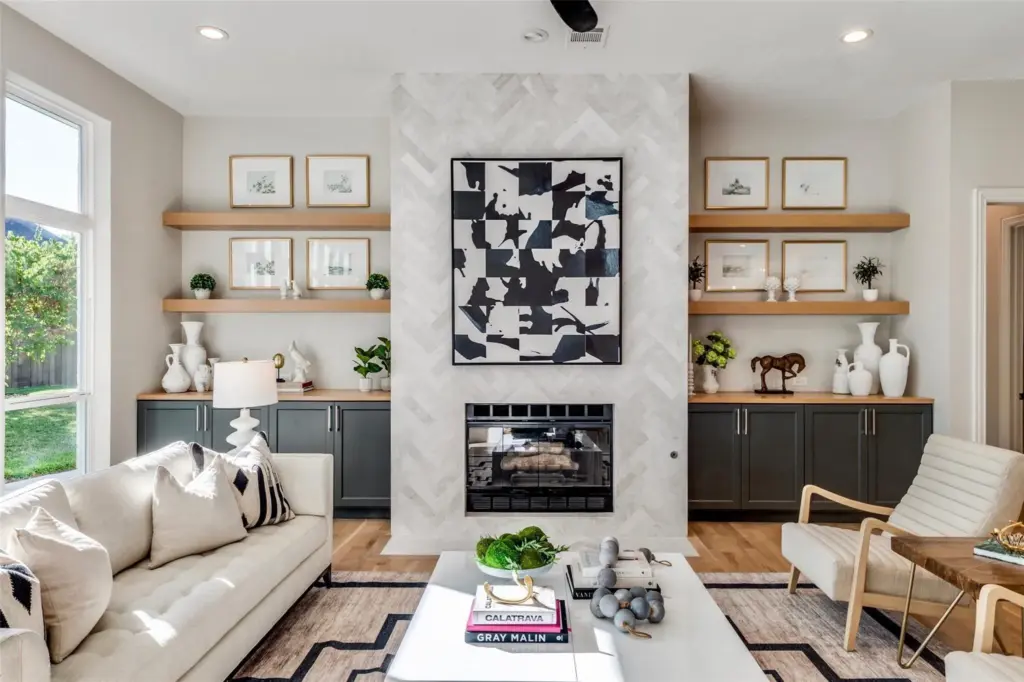 The kitchen effortlessly flows into a second living area with a marble herringbone fireplace and stunning built-ins, providing unobstructed views of the backyard and ensuring that you can chat with guests while whipping up a culinary masterpiece.
