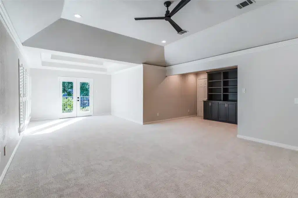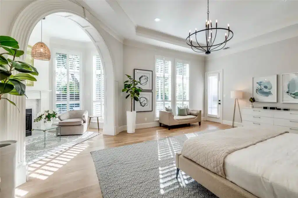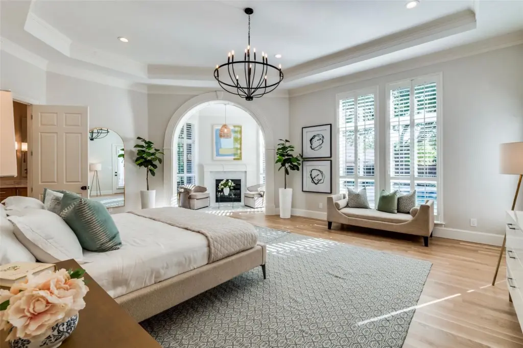 The primary suite is nothing short of impressive offering a luxurious retreat that sets the standard for elegance and comfort. As you enter, you’ll find a private sitting area framed by an archway adorned with detailed molding, providing a serene space if you “Wannabe” alone. Endless windows outfitted with custom shutters let in the natural light and a fireplace adds a touch of coziness to this already enchanting space. The primary suite also offers direct access to the backyard Oasis, adding an extra layer of convenience and luxury making it the ideal place to unwind and rejuvenate.