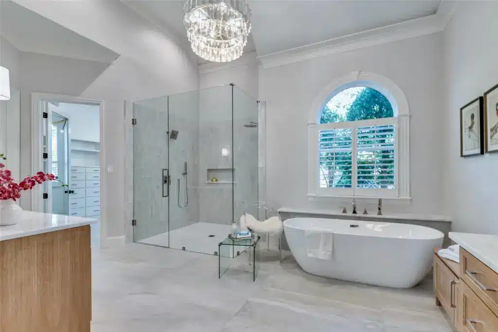 The completely redesigned ensuite bath features a 71-inch soaker tub and a 35-square-foot zero-entry shower with exquisite handmade clay tile walls, all complemented by a marble floor. The oversized shower also offers a luxurious experience with two showerheads, including a 12-inch rain head, and two handhelds. All-new white oak double vanities with marble countertops and oversized medicine cabinets provide ample space for daily routines.