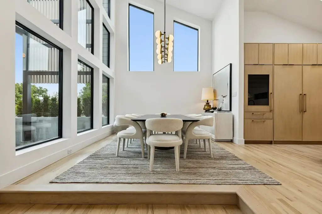 Upon walking through the front pivot door, you’re at once enveloped by the open, inviting interior and enamored by the design. Soft, resurfaced hardwoods, warm designer lighting, and VELUX skylights combine to offer a sophisticated balance to the bold exterior.