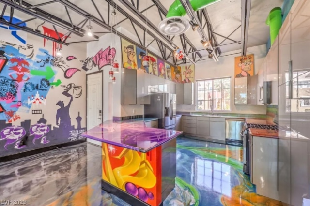 This colorful entry can be found at 5626 Deer Creek Falls Court, Las Vegas, Nevada. It has three bedrooms, two bathrooms and is a little over 3,300 square feet. It is a loft home located minutes from Raiders Stadium and the Las Vegas Strip. The owners are asking $995,000.