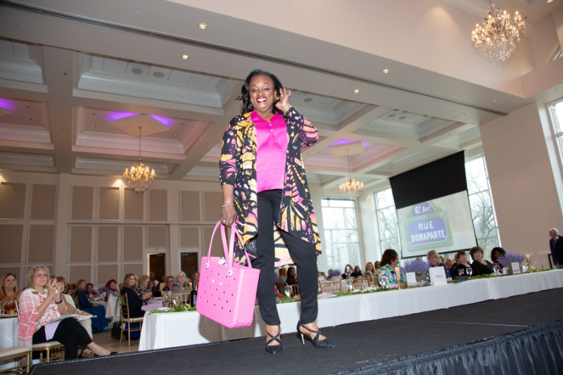 For 27 years, fashion has been a feature of the women’s club’s luncheon fundraiser. French themes set the tone. The show opened with strains of Edith Piaf’s “La Vie En Rose” and slides of French icons such as the Mona Lisa, the Arc de Triomphe, and storefronts of Chanel while spring styles from Dillard’s highlighted the ballroom’s runway.