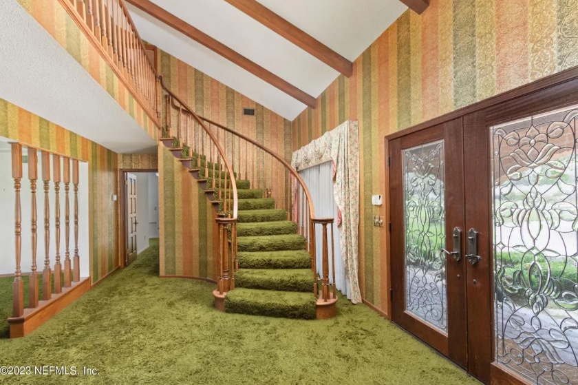 Now what makes this house different from so many others is not just the wall-to-wall green shag carpeting but the fact that all the accents from the draperies to the wallpaper match the shade of said green shag carpeting.